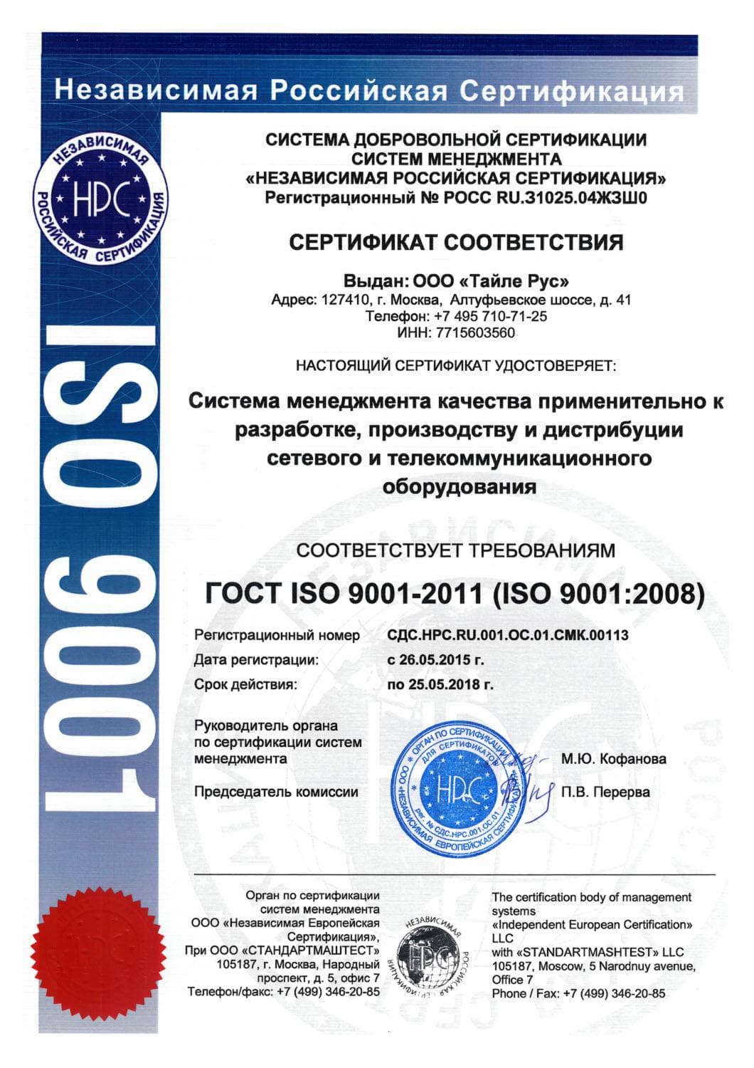 Сертификат ISO 9001 является независимым подтверждением того, что Тайле отвечает требованиям системы менеджмента качества, принятой в более чем 150 странах мира. Это не только подкрепляет тот факт, что Тайле соответствует мировым стандартам качества, но и позволяет компании расширить возможности при сотрудничестве с западноевропейскими и североамериканскими партнерами.