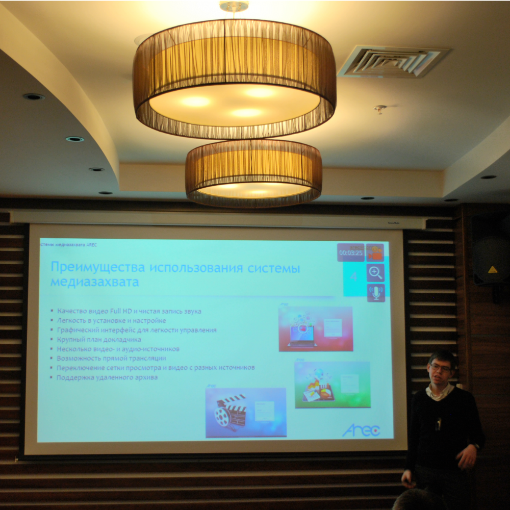 Комплексное решение AREC представлено сетевыми камерами высокого разрешения, устройством автотрекинга с позиционером и медиастанцией с возможностью записи и трансляции. Продукты AREC позволяют вести запись мероприятия с одновременной трансляцией его на YouTube или в другом помещении, что и было продемонстрировано на семинаре.
